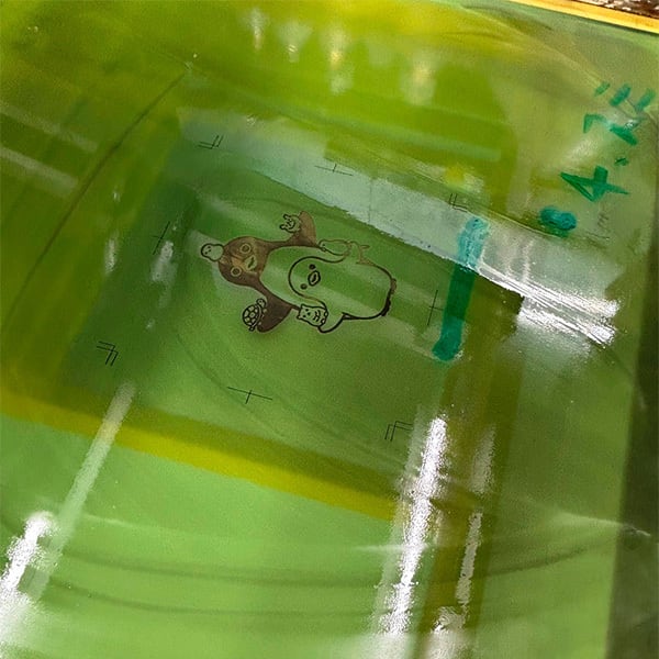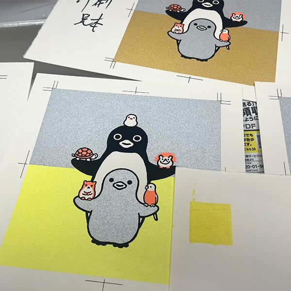 色ごとにひとつの版をつくり、1色刷ったら乾燥させ、乾ききったたら、別の色を刷ってまた乾燥させる……これを何度も何度も繰り返し、ひとつの作品を完成させる技法。美術印刷職人の小林史枝さんによって、ペンギンのイラストは0.01ミリ単位で加工製版され、ほとんどズレやムラのない美しい仕上がりに。