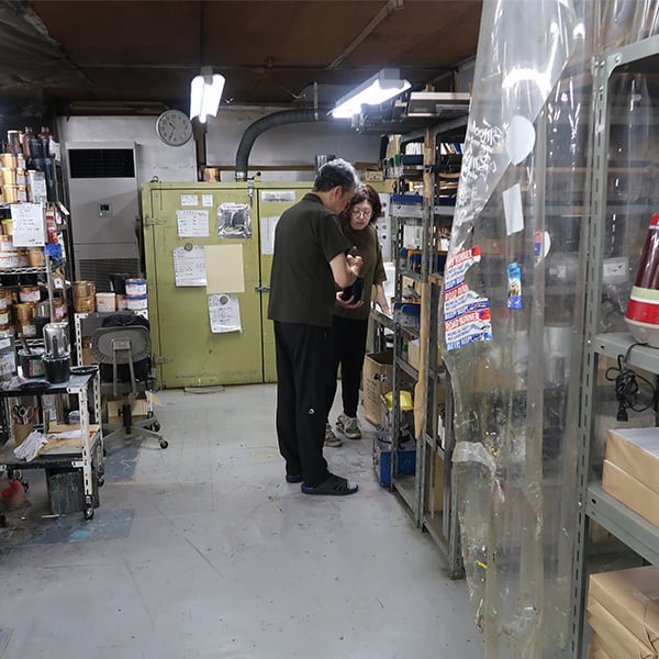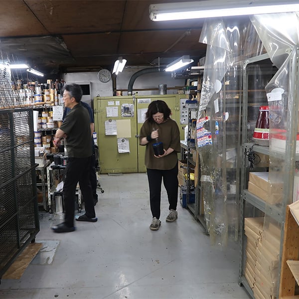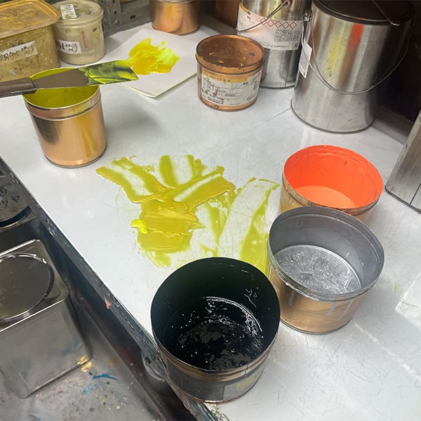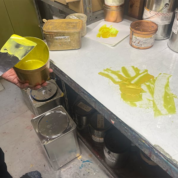 シルク印刷の場合、インクの調合も手作業です。気温や湿度、紙の質感による変化を加味し、手でかき混ぜながらの調色作業。「美術印刷」という近年失われつつある作業工程すべてが、史枝さんの手には残されているのです。