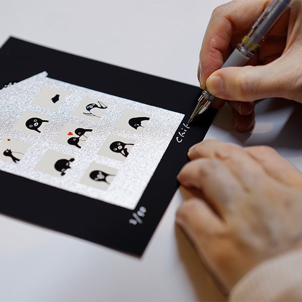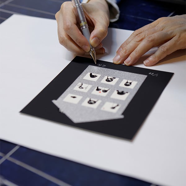 史枝さんは巷に溢れる「ちょっとズレるのが味」的なシルクスクリーン印刷は決して行いません。断固版ズレが起きぬよう、さかざきさんの原画イラストを0.01ミリ単位で修正してくださいます。