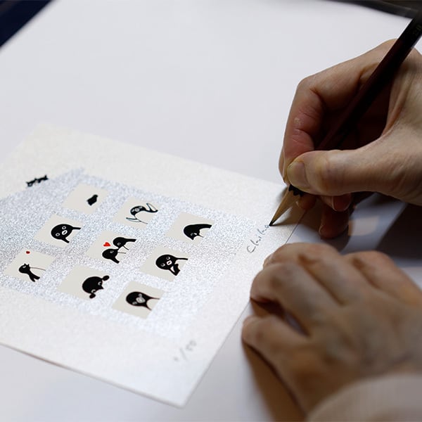 色ごとにひとつの版をつくり、1色刷ったら乾燥させ、乾ききったたら、別の色を刷ってまた乾燥させる……これを何度も何度も繰り返し、ひとつの作品を完成させる技法。美術印刷職人の小林史枝さんによって、ペンギンのイラストは0.01ミリ単位で加工製版され、ズレやムラのない美しい仕上がりが最大の魅力です(高性能プリンターの普及により、制作される機会が少なくなったシルクスクリーン。インクの調合から、製版、刷版、乾燥、断裁に至る全工程が、人の手を必要とする美術印刷)。