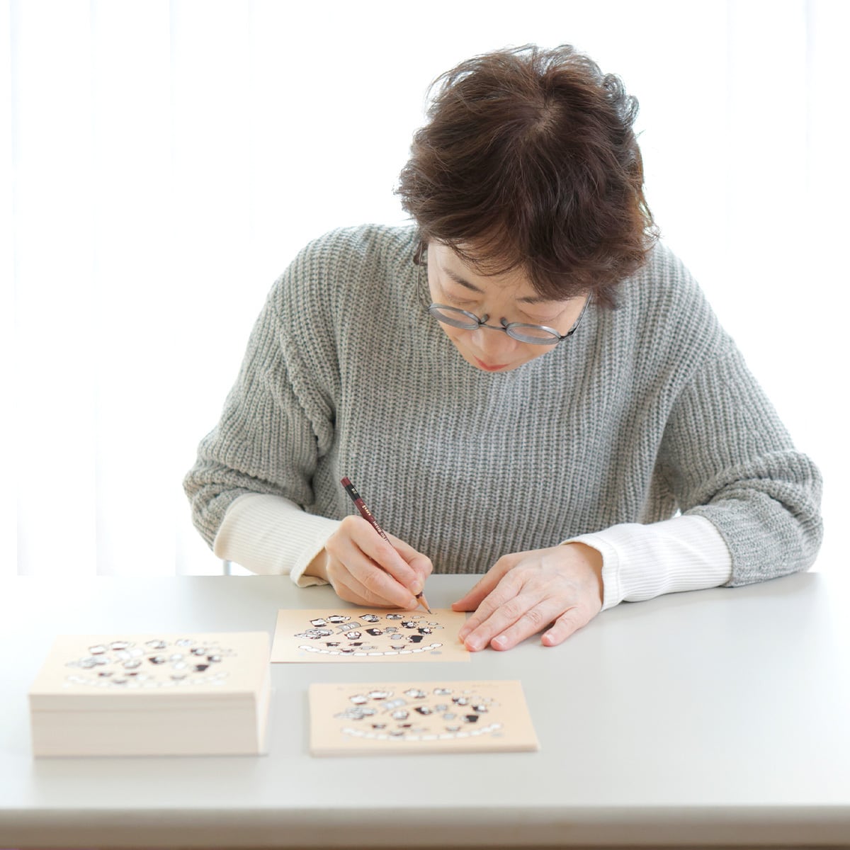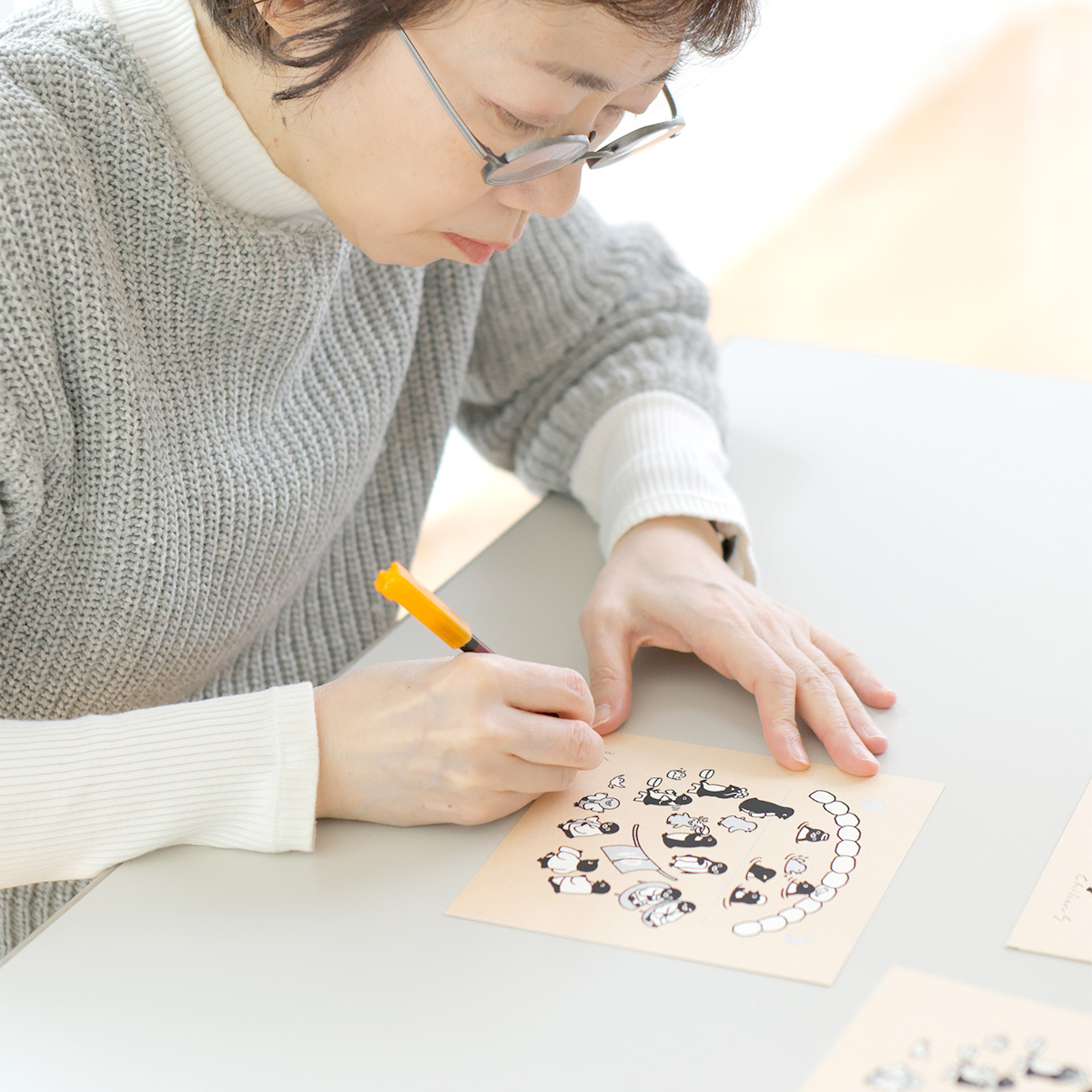 史枝さんによるシルク印刷は「ズレたり、カスレたりするのがかわいい」と一般的に称されるシルク印刷とは一線を画するもの。イラストは0.01ミリ単位で加工・修正され、版ズレなどはどこにもありません。