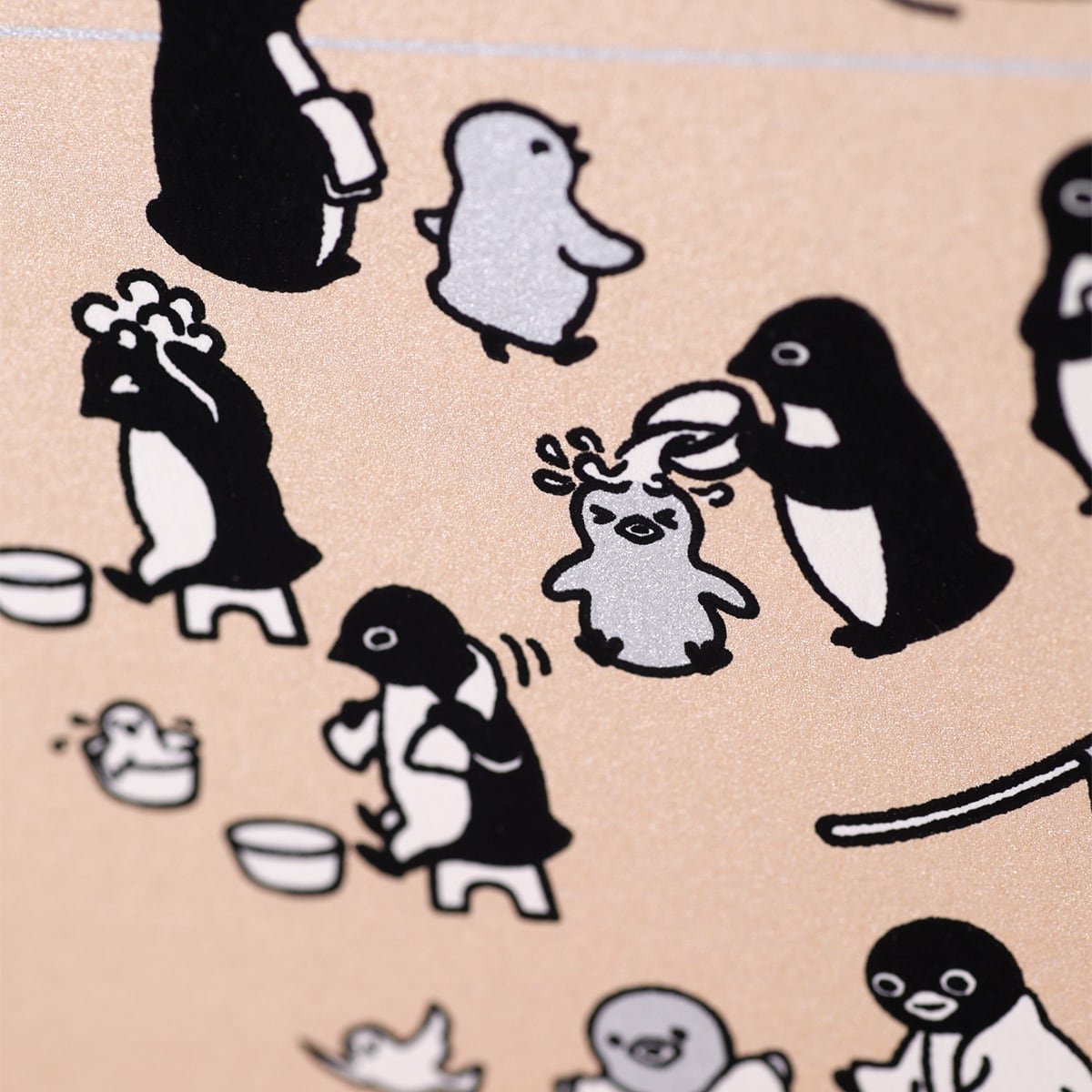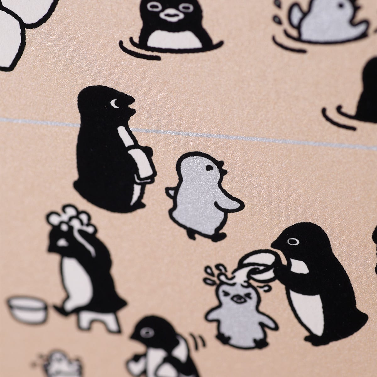 色ごとにひとつの版をつくり、1色刷っては乾燥させ、また1色……と、印刷を重ねる技法。美術印刷職人の小林史枝さんによって、ペンギンのイラストは0.01ミリ単位で製版され、ズレやムラのまったくない美しい仕上がりに。高性能プリンターの普及により、製作機会のめっきり減ったシルクスクリーン。インクの調合から、製版、刷版、乾燥、断裁に至る全工程に人の手を必要とする高級印刷です。