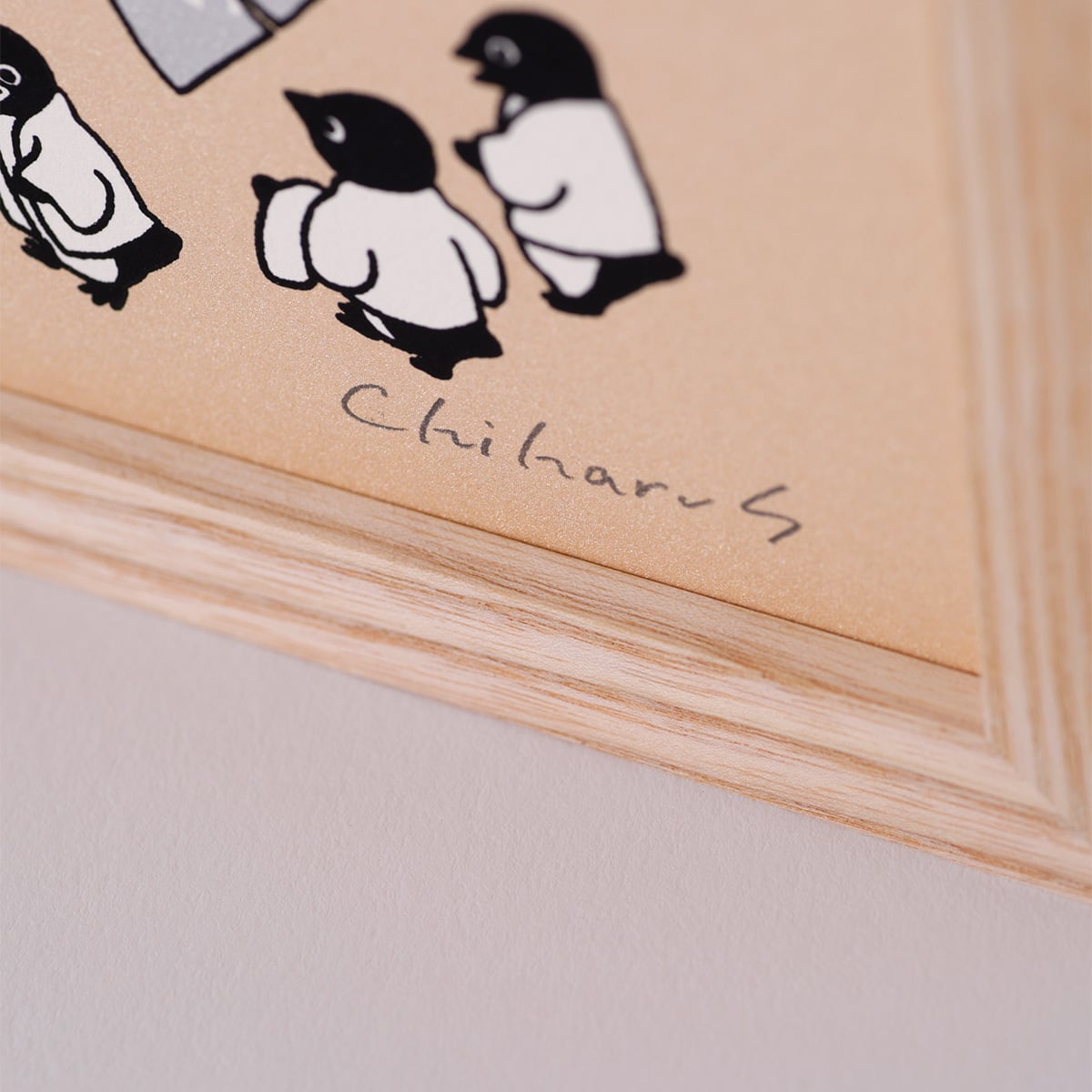 夕やけどきの、輝く陽ざしの再現を試みた新作。明るい陽を浴びて、オレンジパールに輝く温泉戯画の完成です!ペンギンミュージアム所蔵の大人気の原画『ペンギン温泉戯画』に、新たに小鳥の仲間が加わって、描き下ろしされた最新作。オンライン、ペンギンミュージアム、ことりまつりにて順次販売予定です。